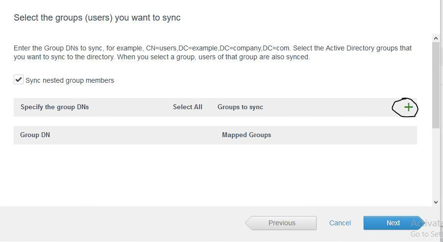 on group page specify DNs for the groups to be synced into vidm and hit Next